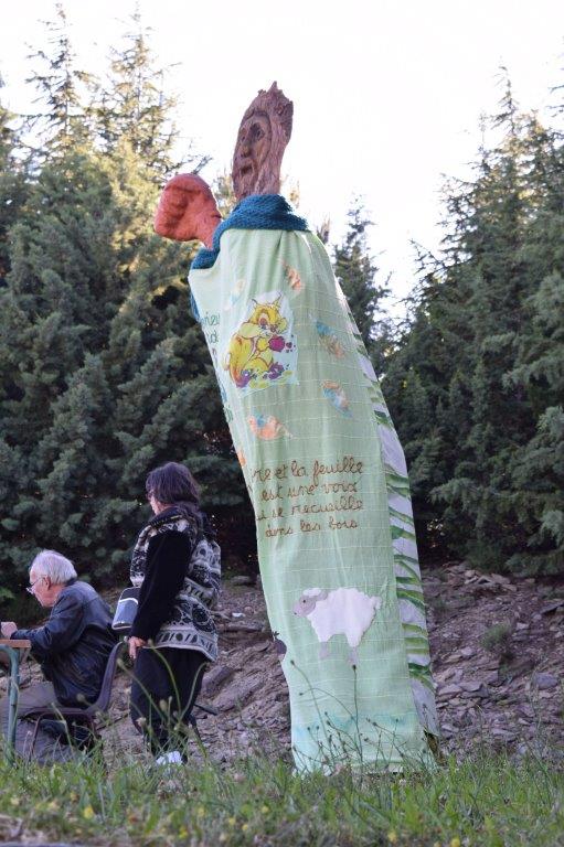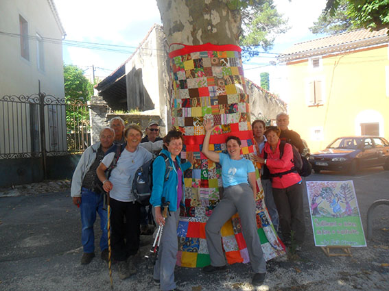 Après un café offert par la mairie de Tauriers, départ effectué ce matin à 10h00 en présence de très nombreux supporters et presque autant de marcheurs accompagnateurs !Et arrivée à Joyeuse le même jour à 16h00. Habillage d’arbres.